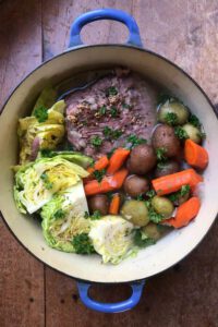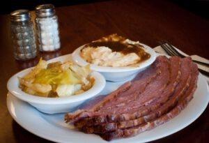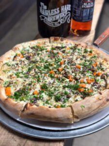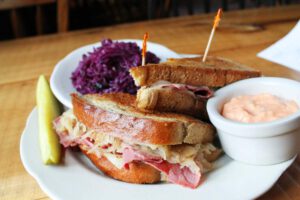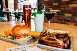 Irish Sunrise Burger: Smash burger patty cooked in house-made herb compound butter. With bacon, Limburger cheese, Irish whiskey blackberry preserve, sunny side up egg, and seasoned arugula. Drizzled with Irish Stout ranch and served with a side of tots and Irish Cream aioli.