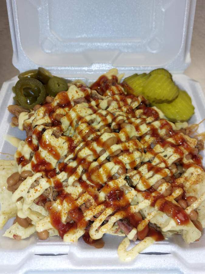 The menu features chopped chicken, pulled pork, chopped brisket and fried ribs, as well as burgers and loaded fries and nachos. Sides include slaw, kraut, baked beans, green beans, cheesy potatoes, crinkly fires and mixed greens with ham. They offer two sauces, sweet or spicy.