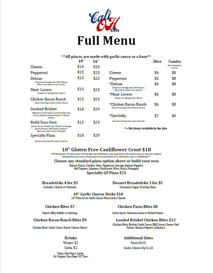 Pizza trailer that mainly sells by the slice. We offer GF crust, breadsticks and chicken bites.