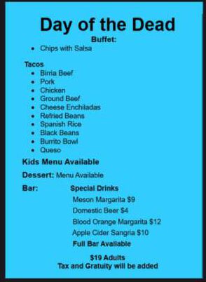 Join us in your best Catrina Face painting or just come and bring your favorite memories of a loved one that have passed….enjoy the Food, Margaritas, Apple Cider Sangria and the tradition!