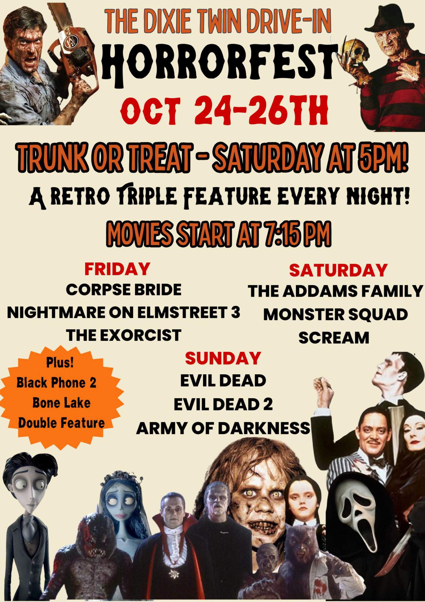 The Dixie Drive-In Horrorfest will have a different retro triple feature every night of the weekend, and a Trunk or Treat on Saturday! Plus a double feature of two new horror films!