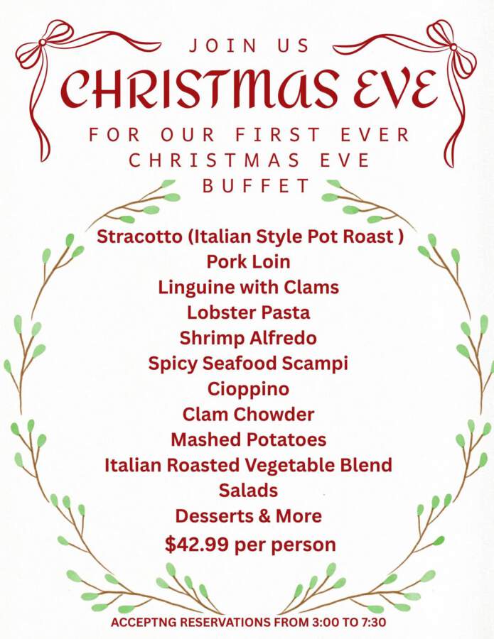 Our buffets are very popular and this year we have decided to offer a Christmas Eve Buffet. For those of us who celebrate the Feast of Seven Fishes, this has you covered. If you don’t care for seafood, we also have you covered. We hope to see you this year for our first ever Christmas Eve Buffet. Call 937-878-1611 to make your reservations. ![]()