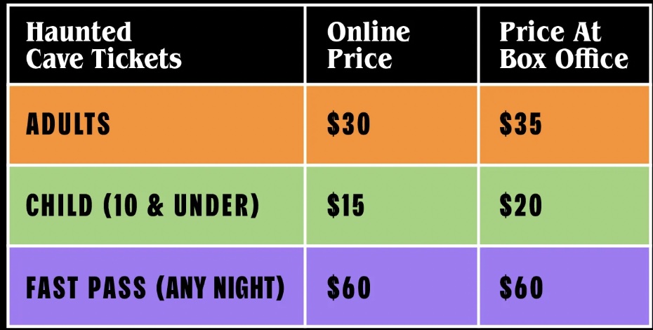 Skip the line and save! Fast Passes and online ticket sales make your night of terror even smoother. Buy your tickets in advance online and save a few bucks. On-site tickets are cash-only, so plan accordingly—and remember, the cave is open rain or shine, and it never sells out!