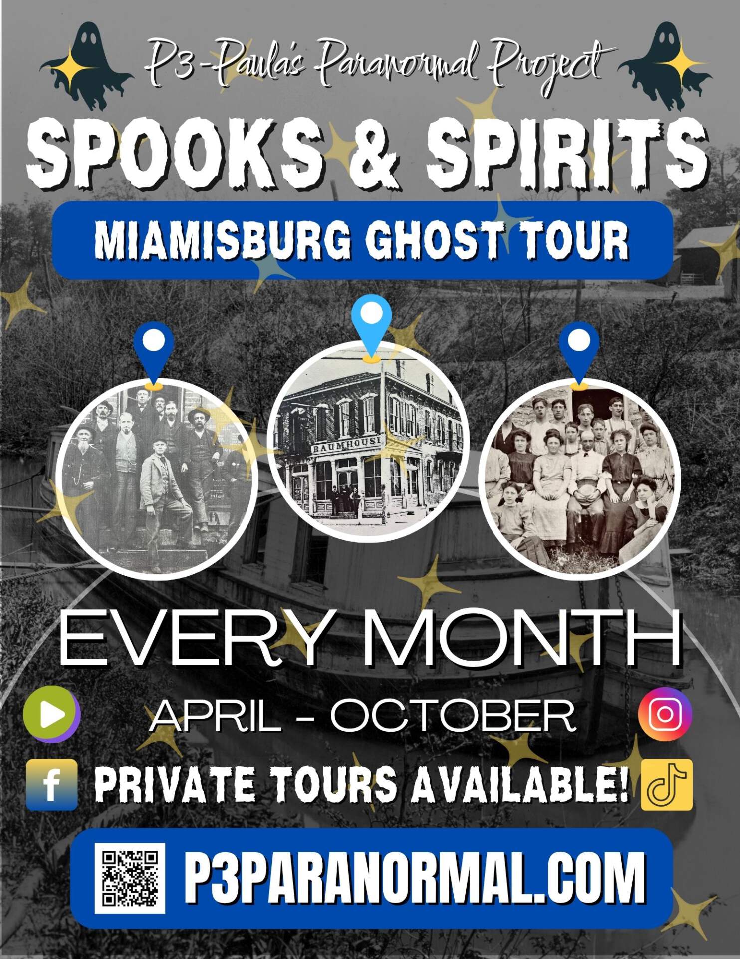 Join us for the Spooks & Spirits Ghost Walking Tour in Miamisburg, Ohio, the “Star City,” where hidden spirits roam the streets of this historic town. Many didnโt know Miamisburg was haunted, but after years of research and exploring the spirit realm, P3 has uncovered an array of restless souls all around. Meet the playful prankster spirits at the Baum Opera House, and delve into Miamisburg’s notorious past, a town once deemed a โcity of sinโ with over 30 bars within a few blocks of downtown. Explore the creepy, interconnected basements that hide countless spirits, and step into the haunted bookstore where we communicate in multiple languages with the other side. Hear the chilling tale of the Lady in White at Veterans Park, the site of an old cemetery that might not have been fully relocated, and discover the story of the most continuously sighted spirit in Ohioโs history. Itโs a haunting experience you wonโt forget!