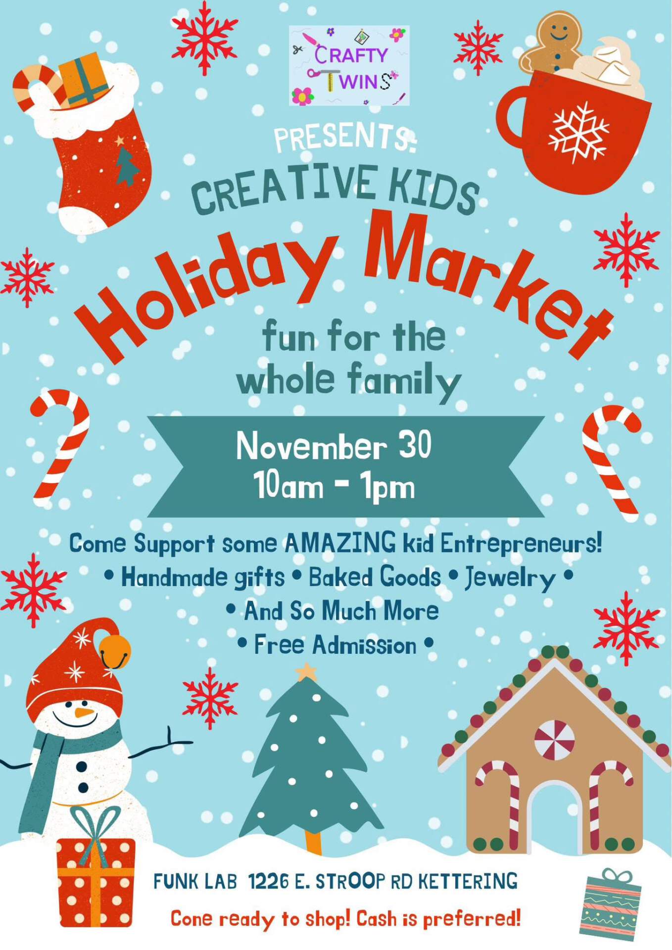 Funk Lab Dance Center 1226 East Stroop, KetteringThe Crafty Twins are hosting the Creative Kids Holiday Market! Sunday November 30 from 10am - 1pm at Funk Lab...