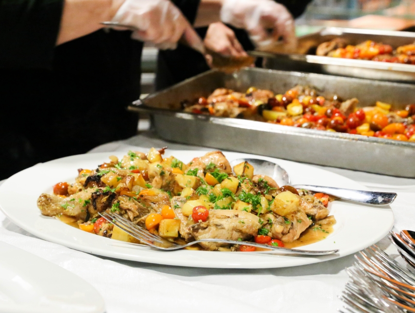 We serve Bourbon Street chicken with rice, red beans, and rice, cornbread and deep fried potatoes.