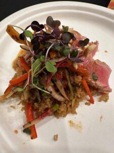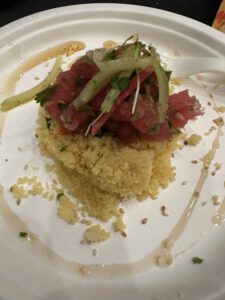 Here were the final dishes, Chef James on the left -wild mushrooms, watermelon and couscous topped with crushed cashews. Chef Jacob on the right served a veggy couscous with an Ahi tuna salad, pickled watermelon chips with toasted sesame seeds.