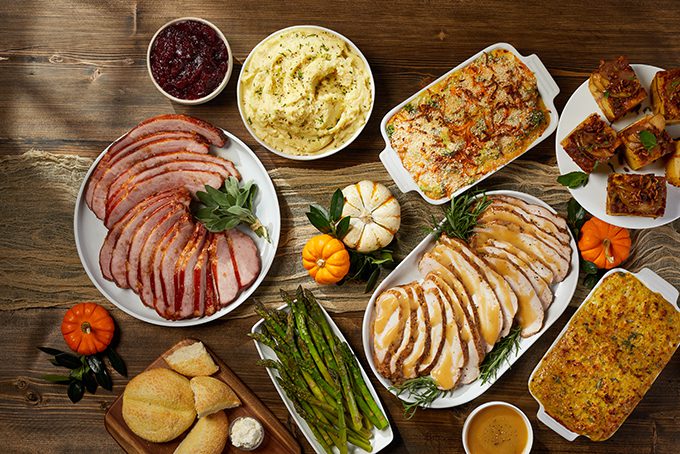 Buffet Menu: Roasted Turkey, Spiral Ham, Gravy & Stuffing, Mashed Potatoes, Cornbread Casserole, Brussels Sprouts & Carrots, Green Beans, Cinnamon Apples, Cranberry Sauce, Mac & Cheese, Pecan & Pumpkin Pie
