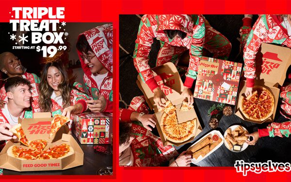 The Triple Treat Box is available for a limited time and is supported by an ad campaign starring quarterback Josh Allen. Allen reminds fans to “go hard” for the holidays, while wearing a pizza-themed Christmas sweater (which is also available from Tipsy Elves).