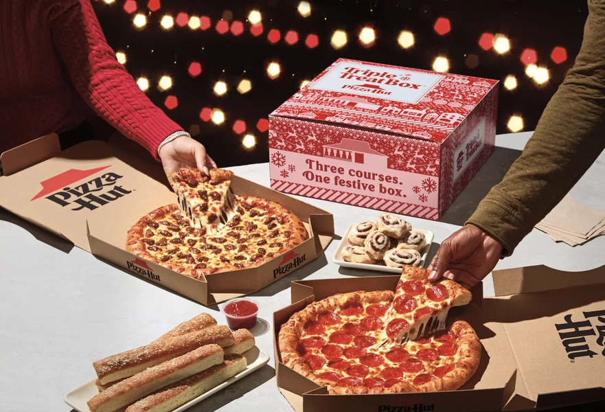 The chain has brought back its popular Triple Treat Box, which contains two medium one-topping pizzas, five breadsticks, and a choice of dessert, all served in a newly designed festive holiday box.